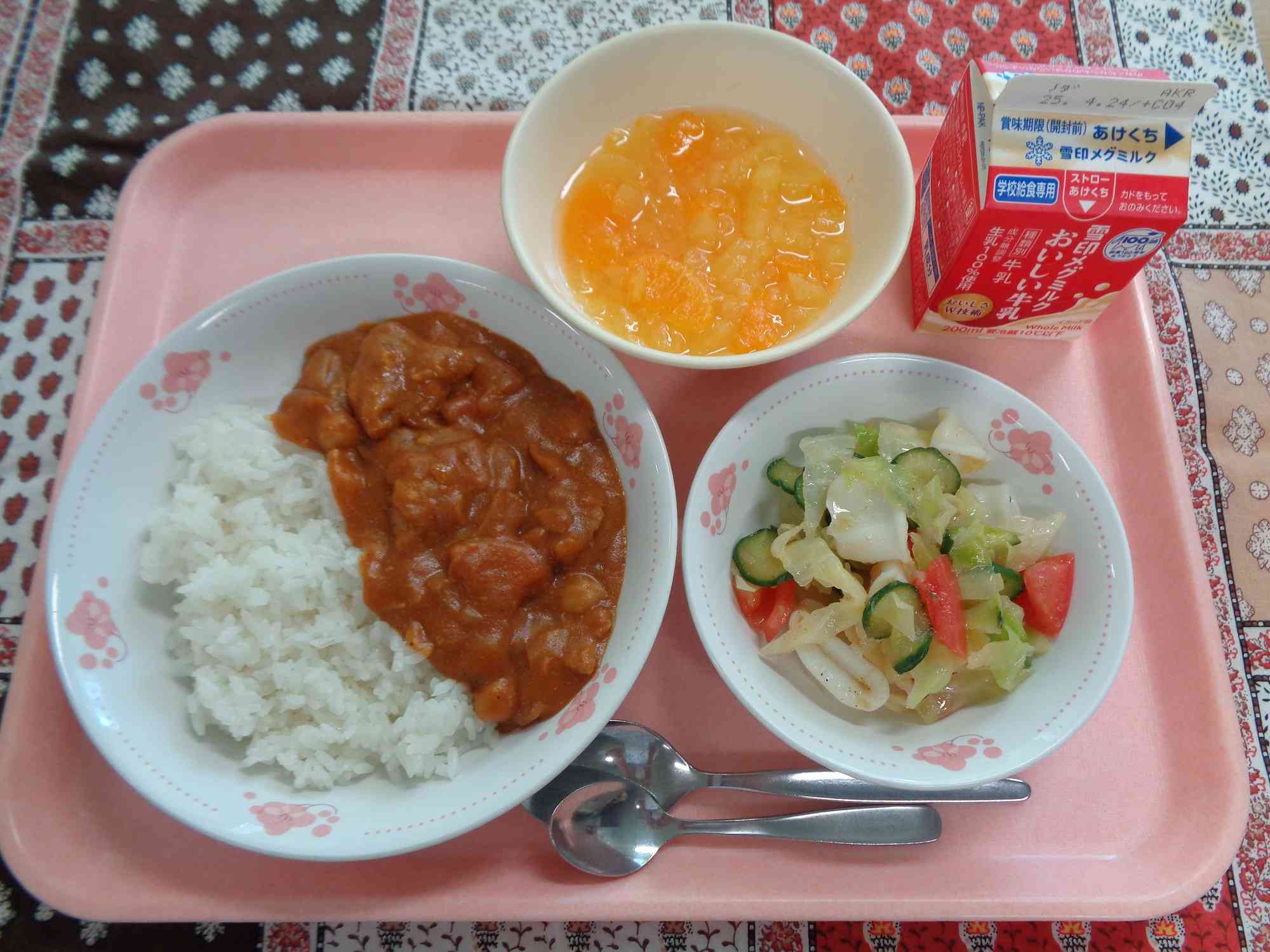 4月14日の給食 ○ひよこまめいりポークカレーライス ○ぎゅうにゅう ○トマトとイカのサラダ ○オレンジクラッシュゼリー 今日は1年生の初めての給食でした! 教室をのぞいて感想を聞いてみると「カレーがおいしいです!!」「おかわりしました!」と、みなさん笑顔で答えてくれました。今日のカレーは辛さを2段階で作り、1年生には辛さ控えめのカレーを提供しています。 初めての給食当番さんも、緊張しながらもお皿をしっかり持ち、上手に盛り付けてくれていました。【添付ファイル】