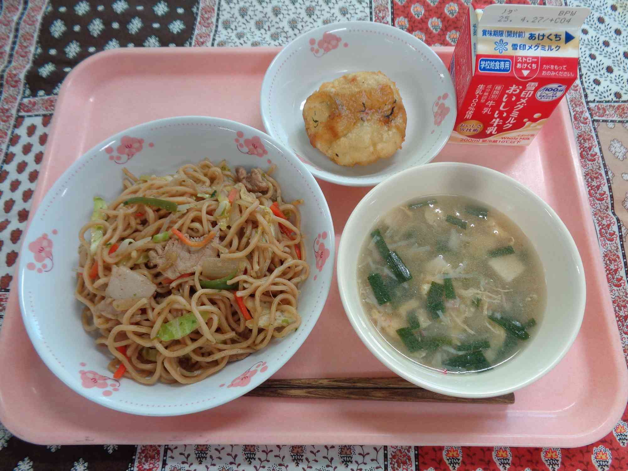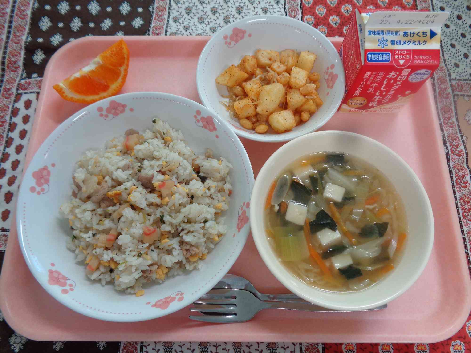 4月15日の給食 ○ソースやきそば ○ぎゅうにゅう ○こまつないりいももち ○かにかまとたまごのちゅうかスープ 4月16日の給食 ○ごもくチャーハン ○ぎゅうにゅう ○スパイシーポテトビーンズ ○とうふのとろみスープ ○デコポン スパイシーポテトビーンズは、でん粉をまぶして揚げた大豆とじゃがいも、ちりめんじゃこに、給食室オリジナル配合のスパイシー粉をまぶしたものです。こどもたちにもとても人気だったので、校内のレシピコーナーに掲示したいと思っています。【添付ファイル】