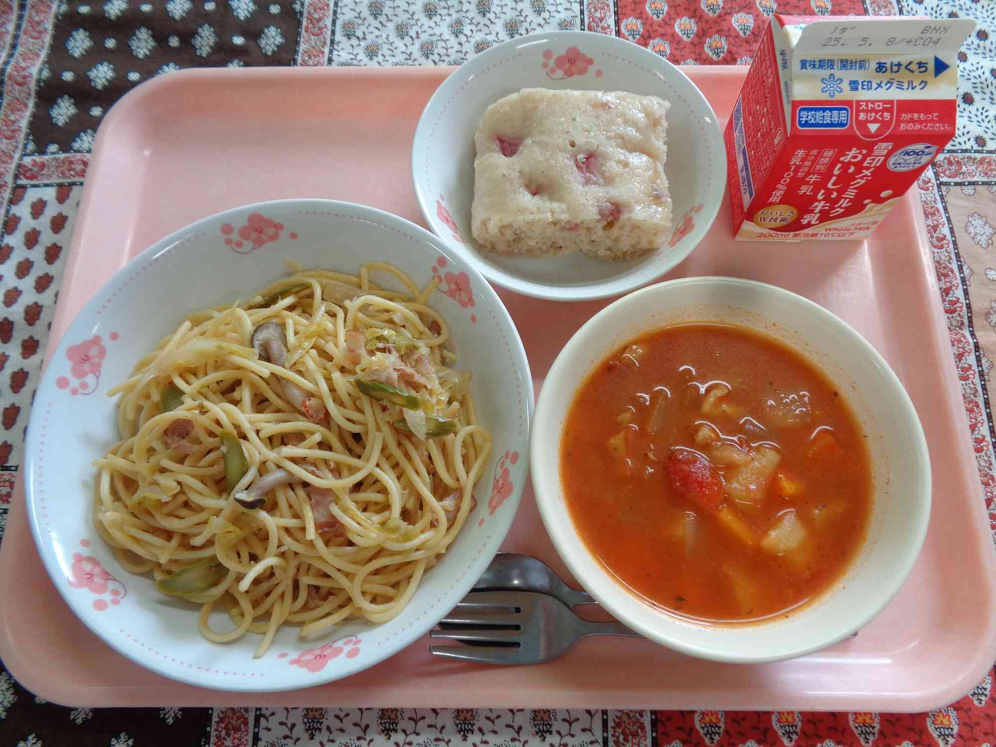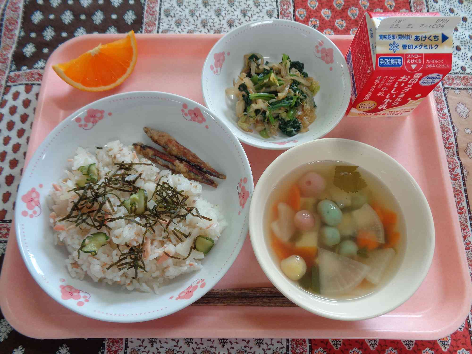 4月25日の給食 ○いわいずし ○ぎゅうにゅう ○きびなごのあまからあげ ○ゆでやさいごまかけ ○てまりふのおすいもの ○きよみオレンジ 少し遅くなりましたが、1年生の入学と2~6年生の進級をお祝いする給食です。彩りよく仕上げ、お祝いの気持ちを表しました。 4月28日の給食 ○はるやさいのペペロンチーノ ○ぎゅうにゅう ○チキンのミネストローネ ○いちごむしパン
