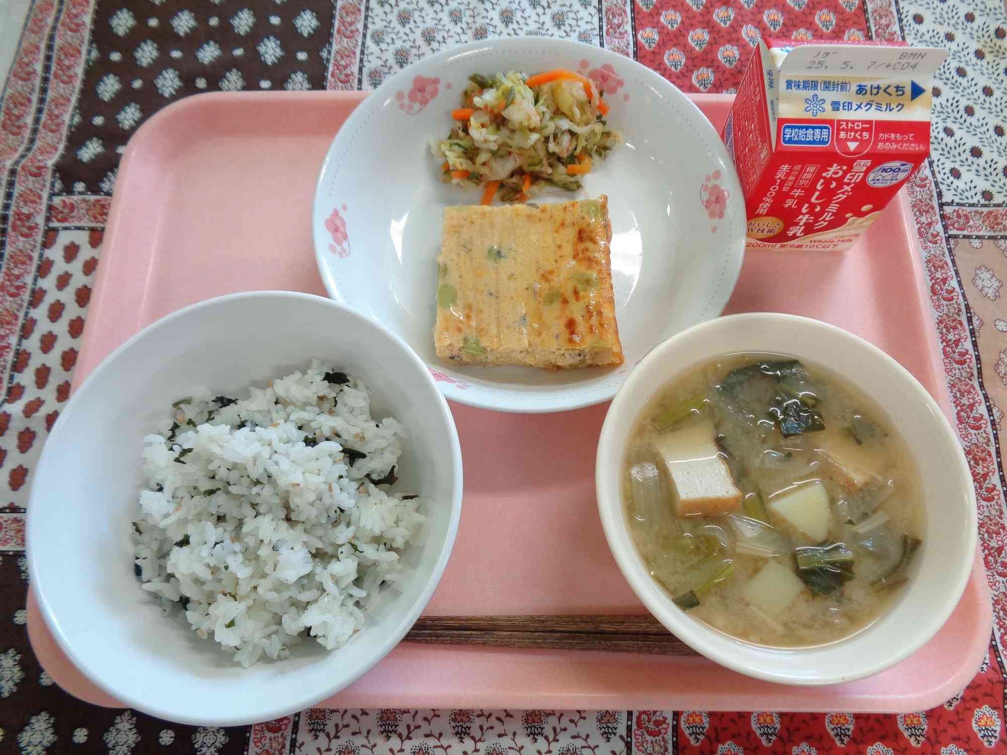 4月30日の給食 ○わかめごはん ○ぎゅうにゅう ○ふくさたまごのしょうがあんかけ ○はくさいのかおりづけ ○なまあげのみそしる 今日の給食の「ふくさたまご」は、おだしがきいた具だくさんのたまご焼きです。「ふくさ」とは、贈り物などを包む布のことです。このふくさのように、たまごが具をふわっと包んでまとめるところから、具が入ったやわらかい厚焼きたまごのことを「ふくさたまご」とよびます。ほかにも和食には、具だくさんの炊き込みごはんを、秋の風で落ち葉が吹き寄せる様子になぞらえて「吹き寄せごはん」と呼ぶなど、素敵な名前がついた料理がたくさんあります。和食って素敵ですね!【添付ファイル】