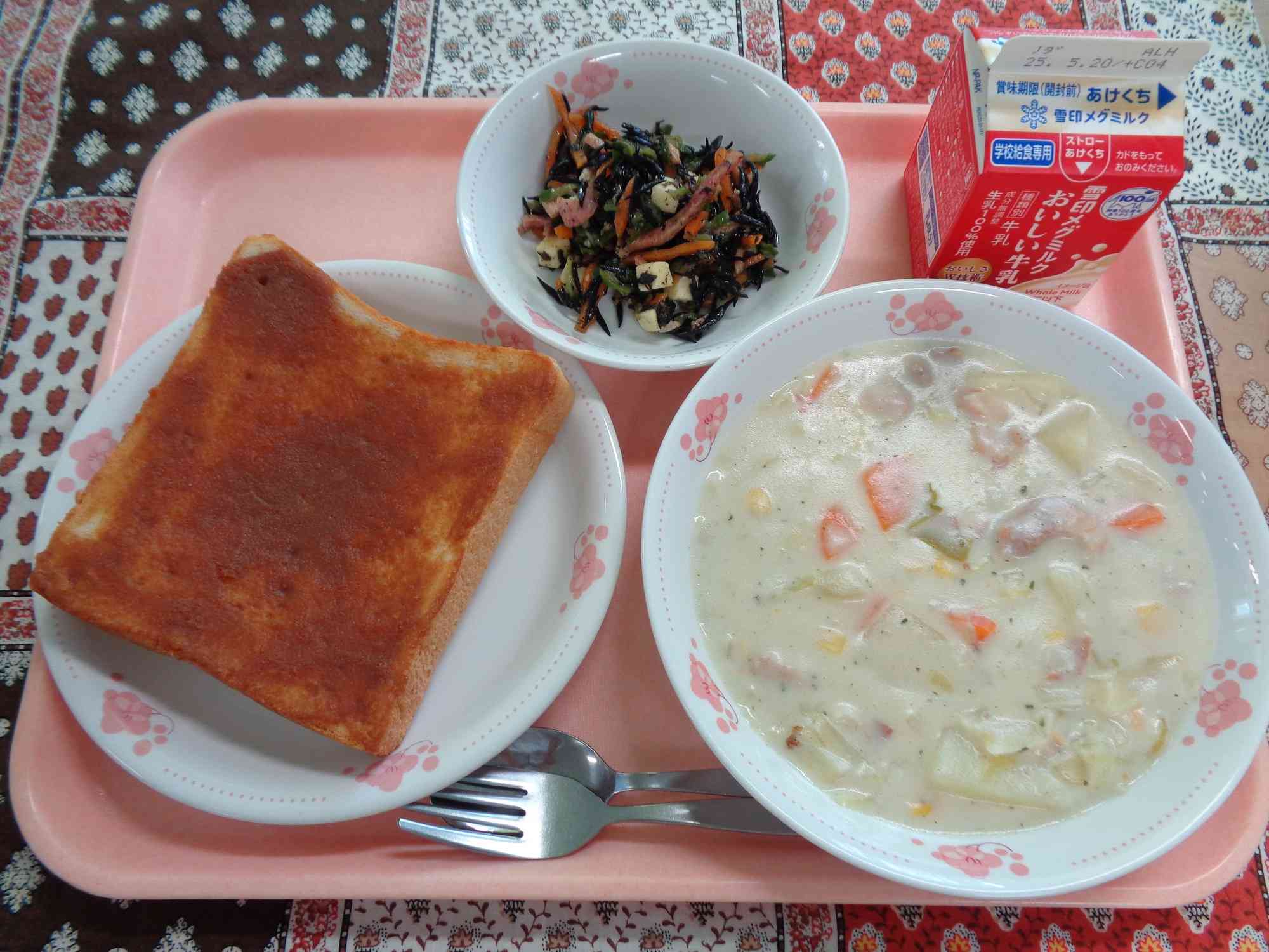 5月8日の給食 ○はちみつきなこトースト ○ぎゅうにゅう ○はるキャベツとコーンのシチュー ○ひじきのマリネ 今日は豊北小人気メニューの1つである、ひじきのマリネを出しました。 給食前から、廊下ですれ違うと「今日のひじきのマリネ、たくさん入れてください!」「楽しみ!!」と声をかけてくれるこどもが多かったです。 どのクラスもとてもよく食べてくれていて、ひじきのマリネの食缶はほぼ空っぽでした!レシピを校内の給食掲示板に掲載しているので、よろしければおうちでもご活用ください。【添付ファイル】