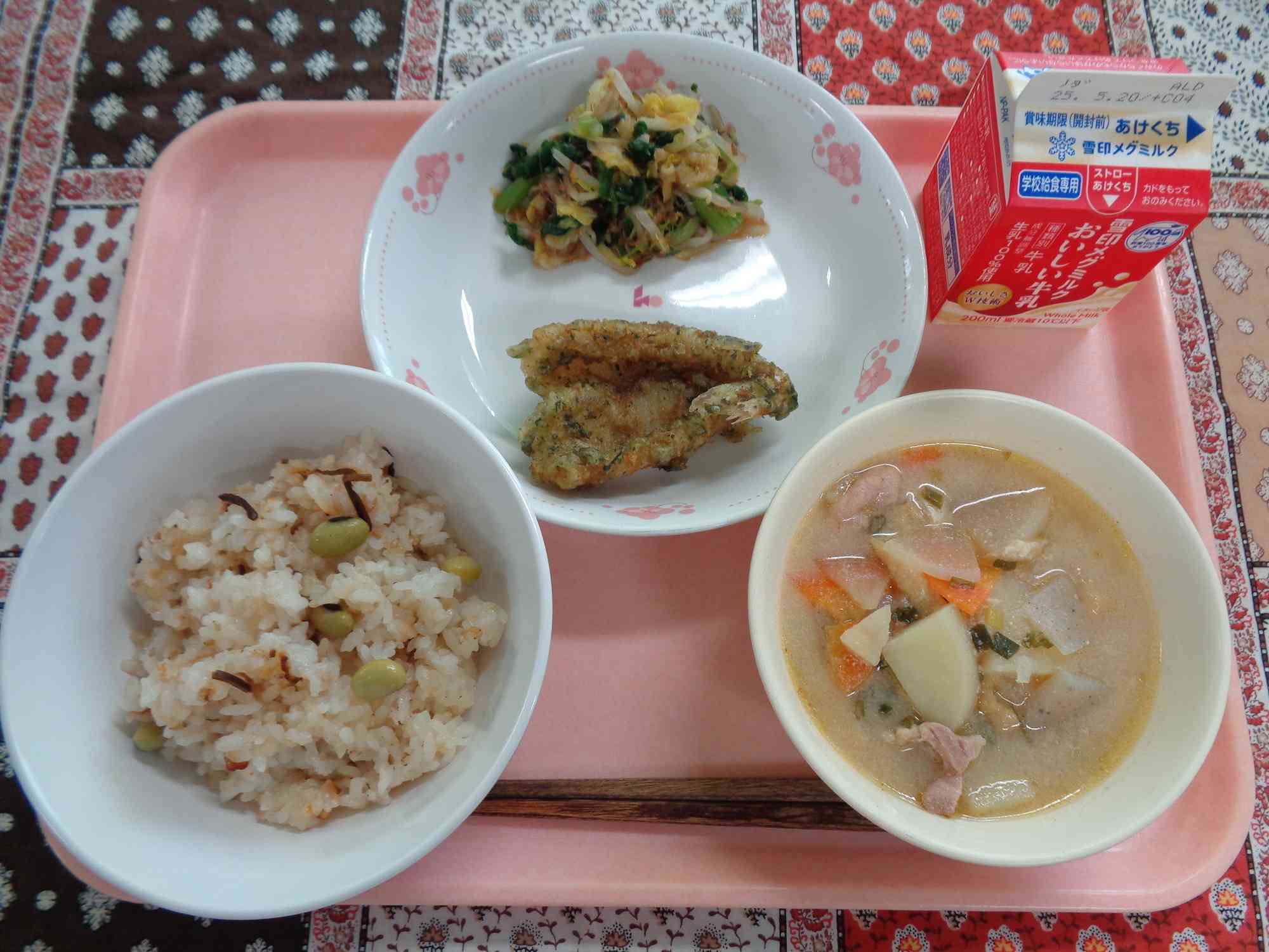 5月9日の給食 ○あおだいずとこんぶのごはん ○ぎゅうにゅう ○おちゃごろものきすのてんぷら ○ゆでやさい とさじょうゆ ○まろやかとうにゅうとんじる 今日の給食の「おちゃごろものきすのてんぷら」は、淡白な味の白身魚のきすに、茶葉を混ぜた衣をつけて油で揚げました。 「♪夏も近づく 八十八夜(はちじゅうはちや)〜」と歌う『茶つみ』という歌がありますが、「八十八夜」とは、暦の上で、冬が終わって春が始まるとされる「立春(りっしゅん)」という日から数えて、88日目のことをいいます。毎年5月1日〜3日頃にあたり、今年は5月1日が「八十八夜」でした。 日本では、昔はこの立春が暦の中心になっていたため、立春を基準に、節分やお彼岸など、さまざまな節目があります。八十八夜もそんな節目の日の1つで、春から夏へ移る境目となる日です。 このころになると、急に霜が降りることもなく、気候が安定してくるため、「八十八夜の別れ霜」や「夏も近づく八十八夜」などといわれ、さらに八十八という字を組み合わせると「米」になることから、さまざまな農作業の目安とされてきました。 新茶を摘み取る目安の日ともなっているので、この時期は茶摘みがさかんになり、昔から特に八十八夜に摘んだお茶を飲むと1年間病気をせず、健康に過ごせるといわれています。 給食でも、今年の新茶を衣に混ぜた天ぷらで、1年の健康を願いました。 お茶の香りがかすかに香る、少し大人味の天ぷらでしたが、こどもたちもよく食べてくれていました!【添付ファイル】
