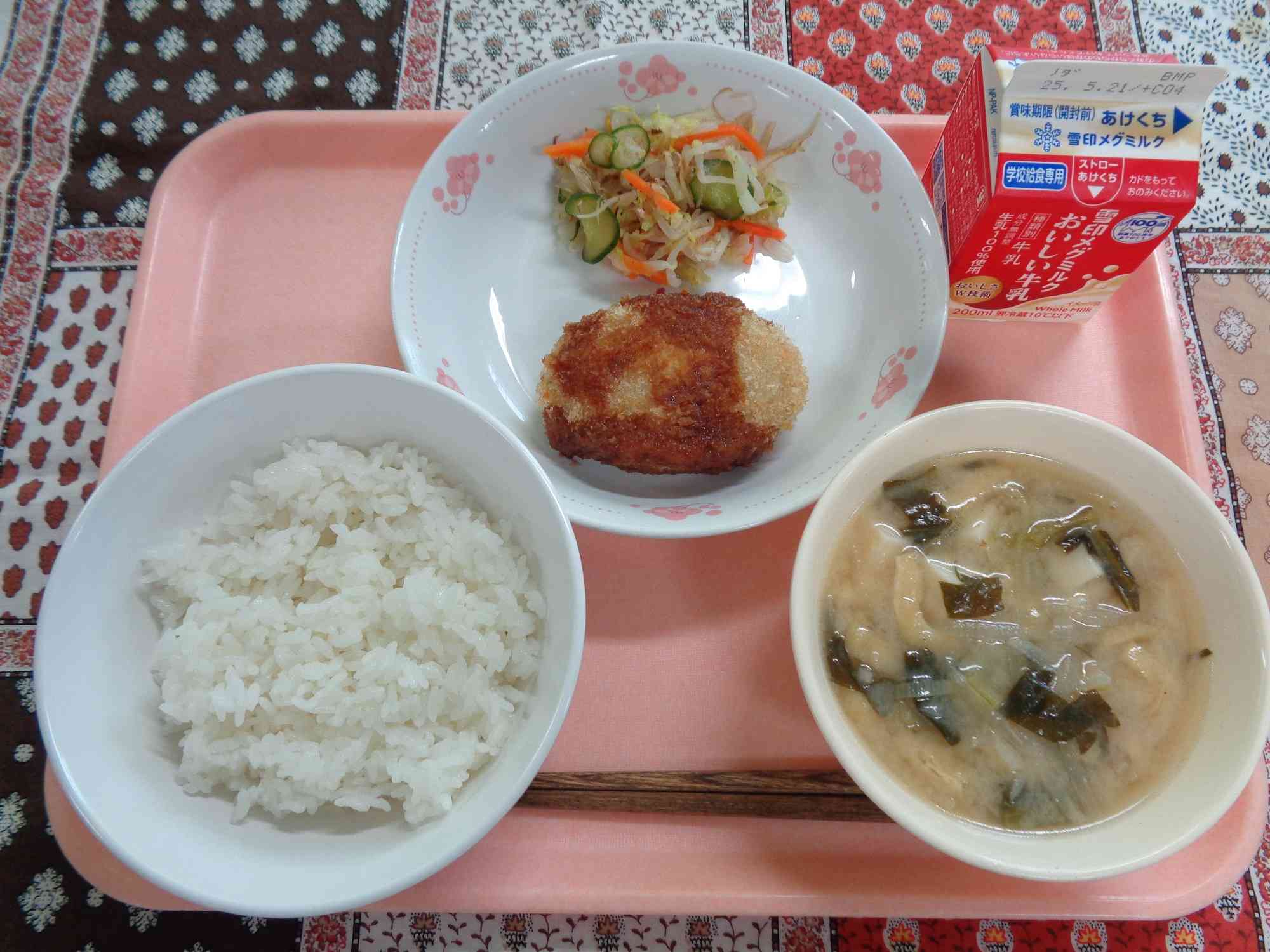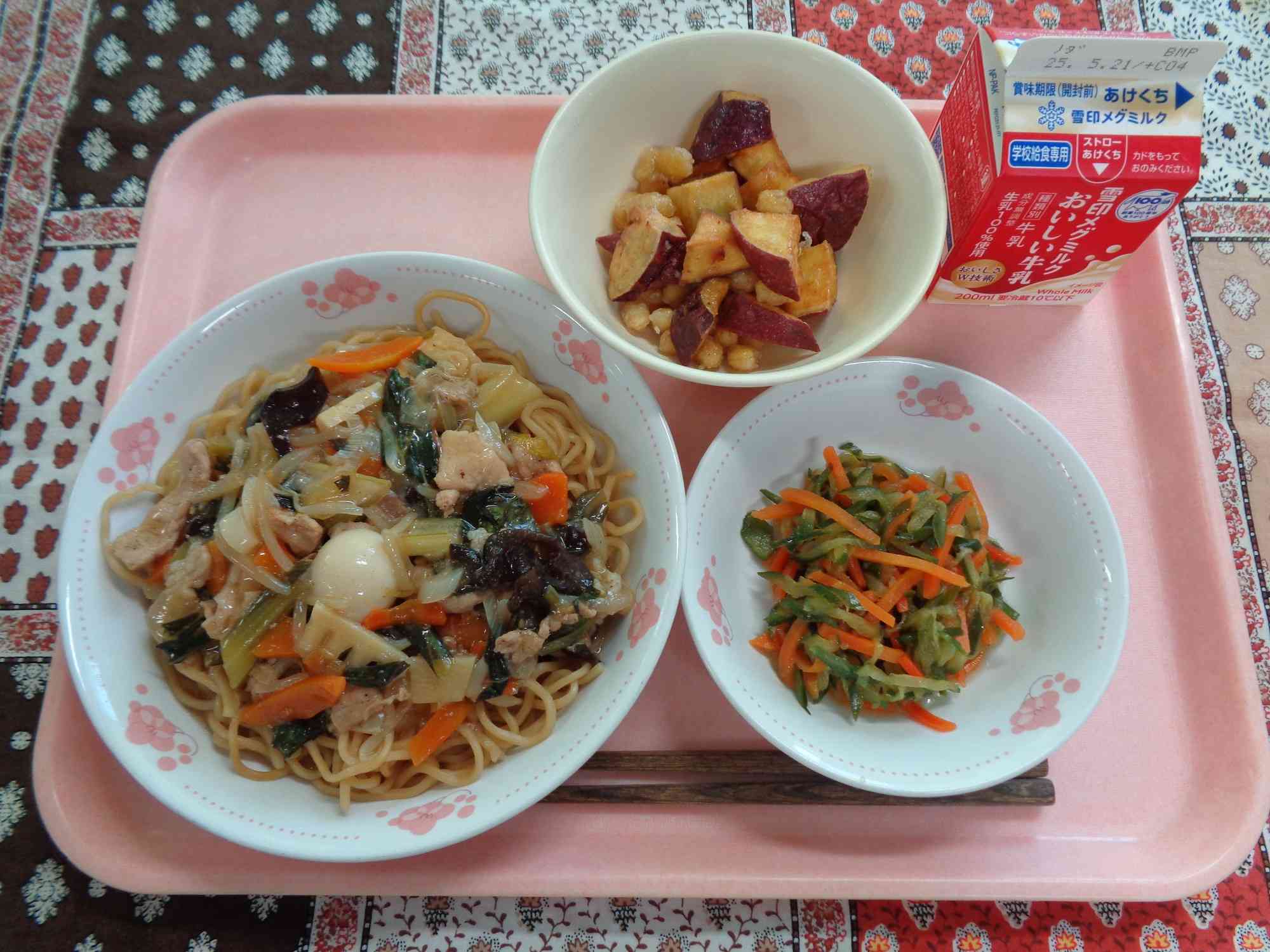 5月12日の給食 ○ごはん ○ぎゅうにゅう ○うずらたまごいりコロッケ ○キャベツのかおりづけ ○だいこんととうふのみそしる 5月13日の給食 ○ぶたにくとあおなのあんかけやきそば ○ぎゅうにゅう ○きゅうりとにんじんのかふうあまず ○ちゅうかまめポテト 今日はどの料理も人気メニューで、残菜も少なかったです!具だくさんのあんかけやきそばは、野菜のうまみがたっぷりでおいしく、おかわりの列を作っているクラスがたくさんありました。【添付ファイル】