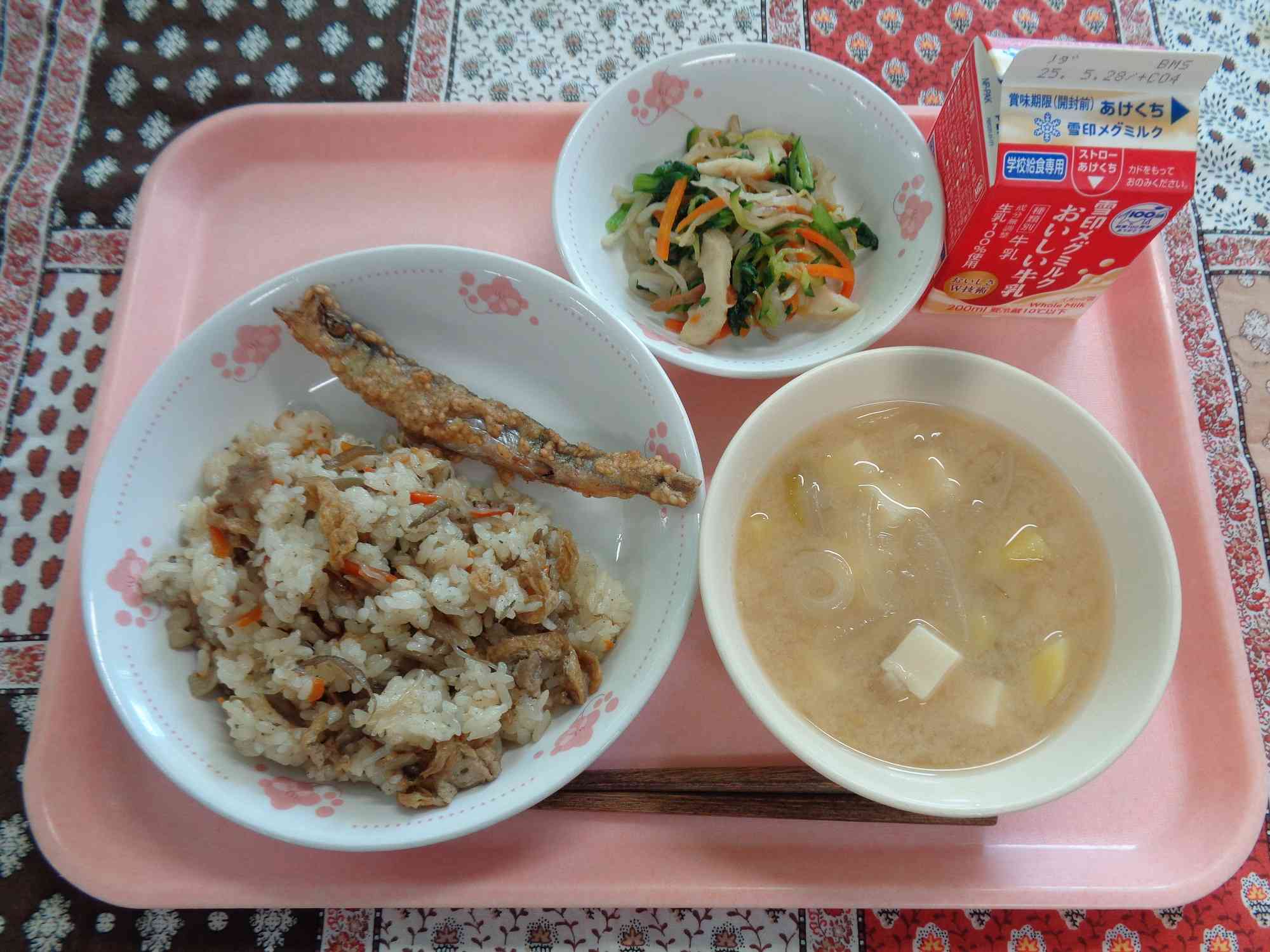 5月19日の給食 ○ごはん ○ぎゅうにゅう ○とうふとえびのうまに ○ピリからだいこん ○バナナ 5月20日の給食 ○きんぴらごはん ○ぎゅうにゅう ○ししゃものごまあげ ○ちくわいりあえもの ○たまねぎのみそしる ししゃもは、白ごまを混ぜた衣液をまとわせ、油でカリッと揚げました。ごまの風味が香ばしく、こどもたちからも人気がありました!ししゃもなどの小魚類は、カリッと揚げることで頭から尻尾までまるごと食べられるので、カルシウムをたくさん摂ることができます。おうちでもぜひ積極的に取り入れてみてください。【添付ファイル】
