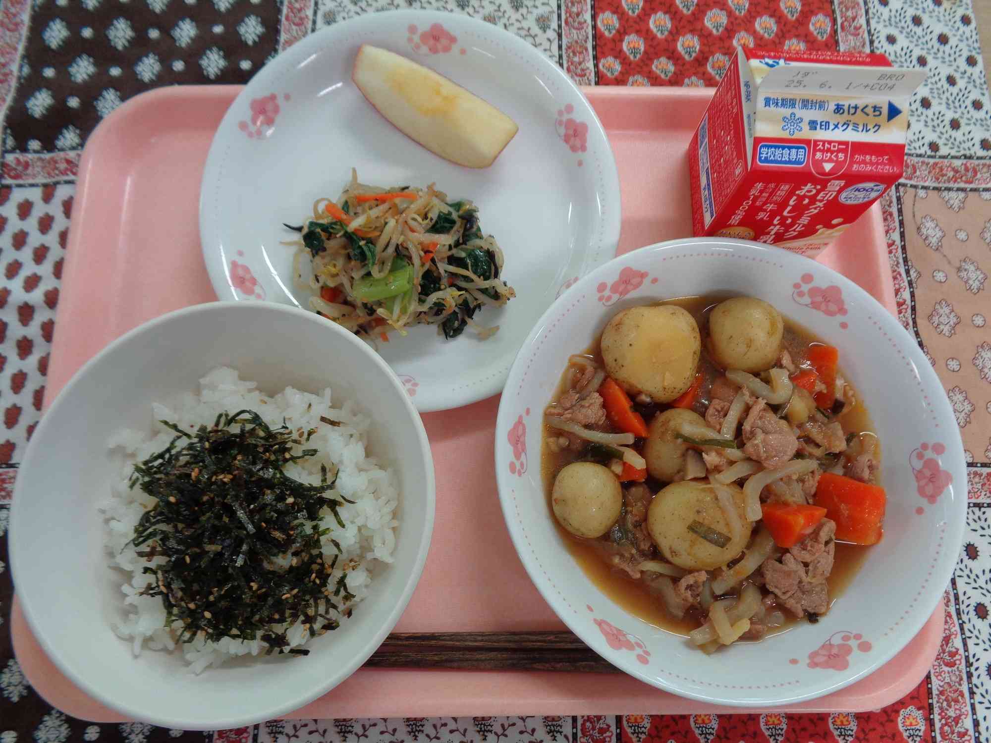 5月21日の給食 ○ごはん キムムッチ ○ぎゅうにゅう ○コチュジャンにくじゃが ○こまつなとひじきのナムル ○りんご 今日は韓国風で1食をまとめました。 「キムムッチ」は、韓国語で「キム」がのり、「ムッチ」は和える、という意味で、韓国風のりのふりかけです。 韓国のりのような味付けで、こどもたちは白いご飯がよくすすんだようでした。