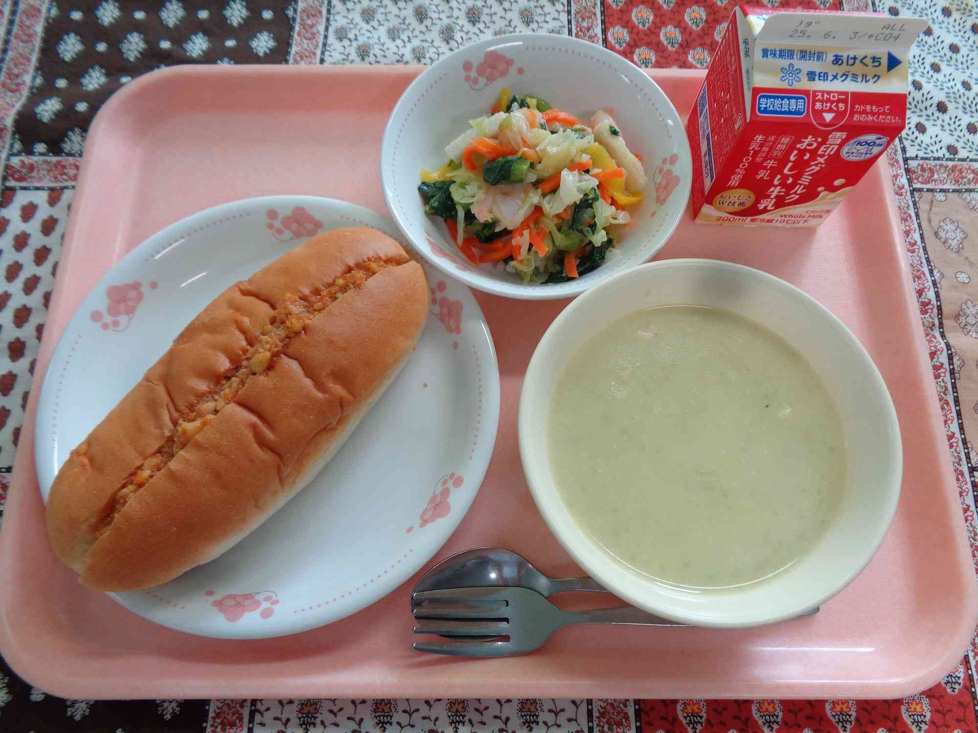 5月22日の給食 ○チリビーンズドッグ ○ぎゅうにゅう ○シーフードサラダ ○さわやかおまめのすうぷ(おはなし給食) 今日の給食は、本に出てくるおいしそうな料理を再現した「おはなし給食」です。『ぎょうれつのできるすうぷやさん(作・絵:ふくざわゆみこ、教育画劇)』という本に出てくる「さわやかおまめのすうぷ」というスープを作りました。絵本のように、今旬を迎えている生のグリンピースをたっぷり使っています。 給食時間には、各クラスに今回の絵本を紹介するプリントを配りました。給食から読書に、そして読書から食にもっと関心を持ってもらえるとうれしいです。今日取り上げた本は、給食掲示板付近に置いておくので、ぜひ読んでもらえればと思います。【添付ファイル】