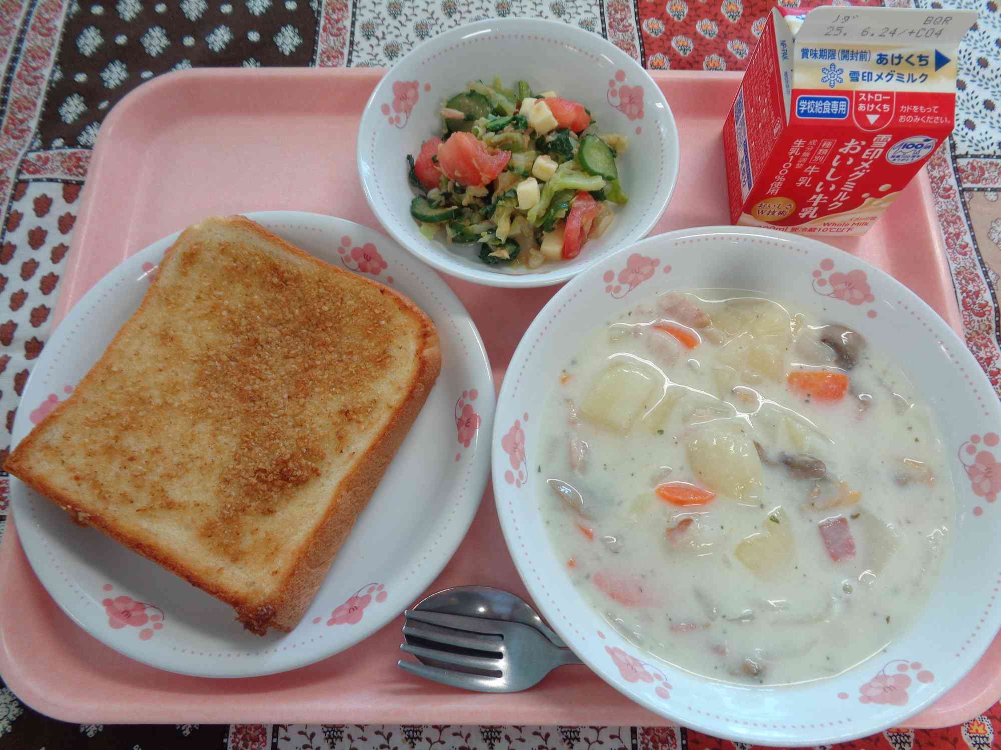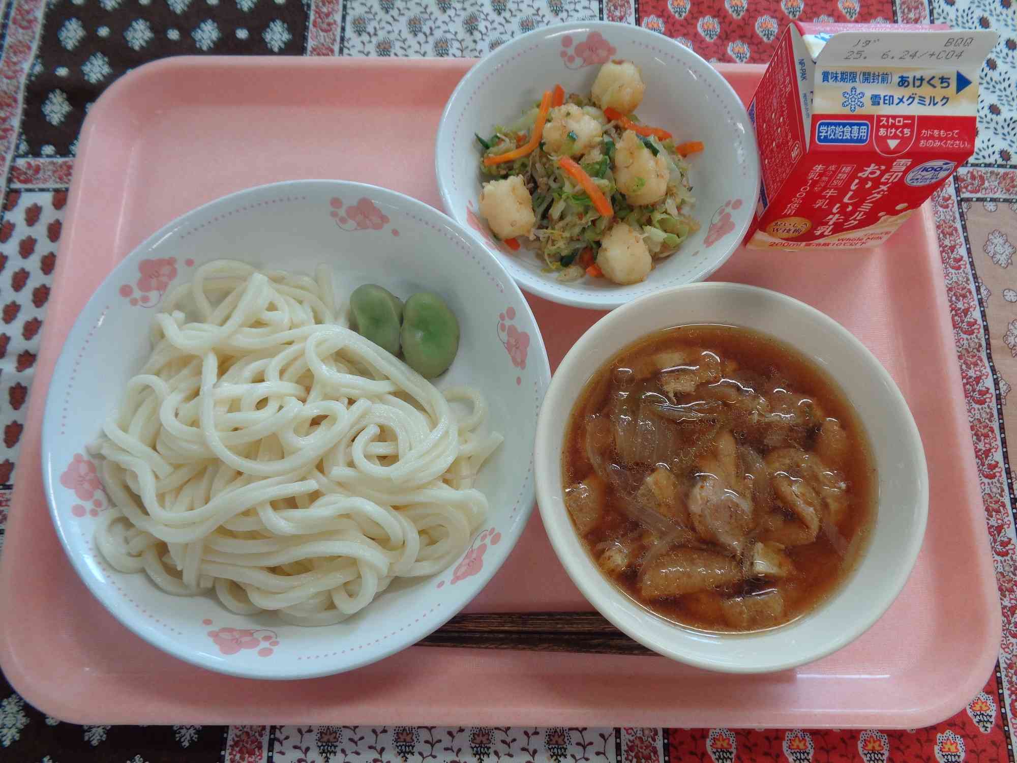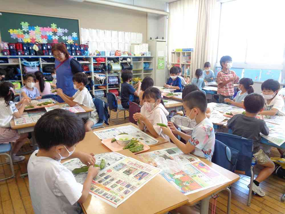 6月17日の給食 ○セサミハニートースト ○ぎゅうにゅう ○ニューイングランドふうクラムチャウダー ○こまツナサラダ 6月18日の給食 ○とりじるつけうどん ○ぎゅうにゅう ○あげどうふのサラダ ○ゆでそらまめ 今日の給食の「ゆでそらまめ」は、八百屋さんが鞘付きのままの状態で届けてくれたそら豆を、豊洲北小の2年生全員でその鞘をむいて、中の豆を1つ1つ丁寧に取り出してもらったものです。 そら豆は、4月〜6月の春から夏のはじめにかけて「旬」を迎える、とてもおいしい野菜です。 今日はそんなそら豆自体の味を味わってもらいたいと思い、塩茹でしたものをそのまま出しました。青々とした色合いやほのかな甘みは、旬の時期ならではの味わいです。 事前に2年生の各クラスで『そらまめくんのベッド』という絵本を読み聞かせしてもらったため、2年生のみなさんは、そら豆のさやむきをとっても楽しみにしてくれていたようです。 さやむきをして、2年生は「ほんとにそらまめくんのベッド、ふっかふか〜!!」「きもちいい〜!!」と目を輝かせ、感激している子がたくさんいました。 給食時間、2年生に「自分たちでむいたそら豆、おいしいですか〜?」と聞くと「おいしいでーす!」とほぼみなさんが元気に教えてくれました。自分たちでさわったり、においをかいだりしながら、大事に扱った食材を、実際に味わう喜びを感じてもらえるといいなと思います。【添付ファイル】