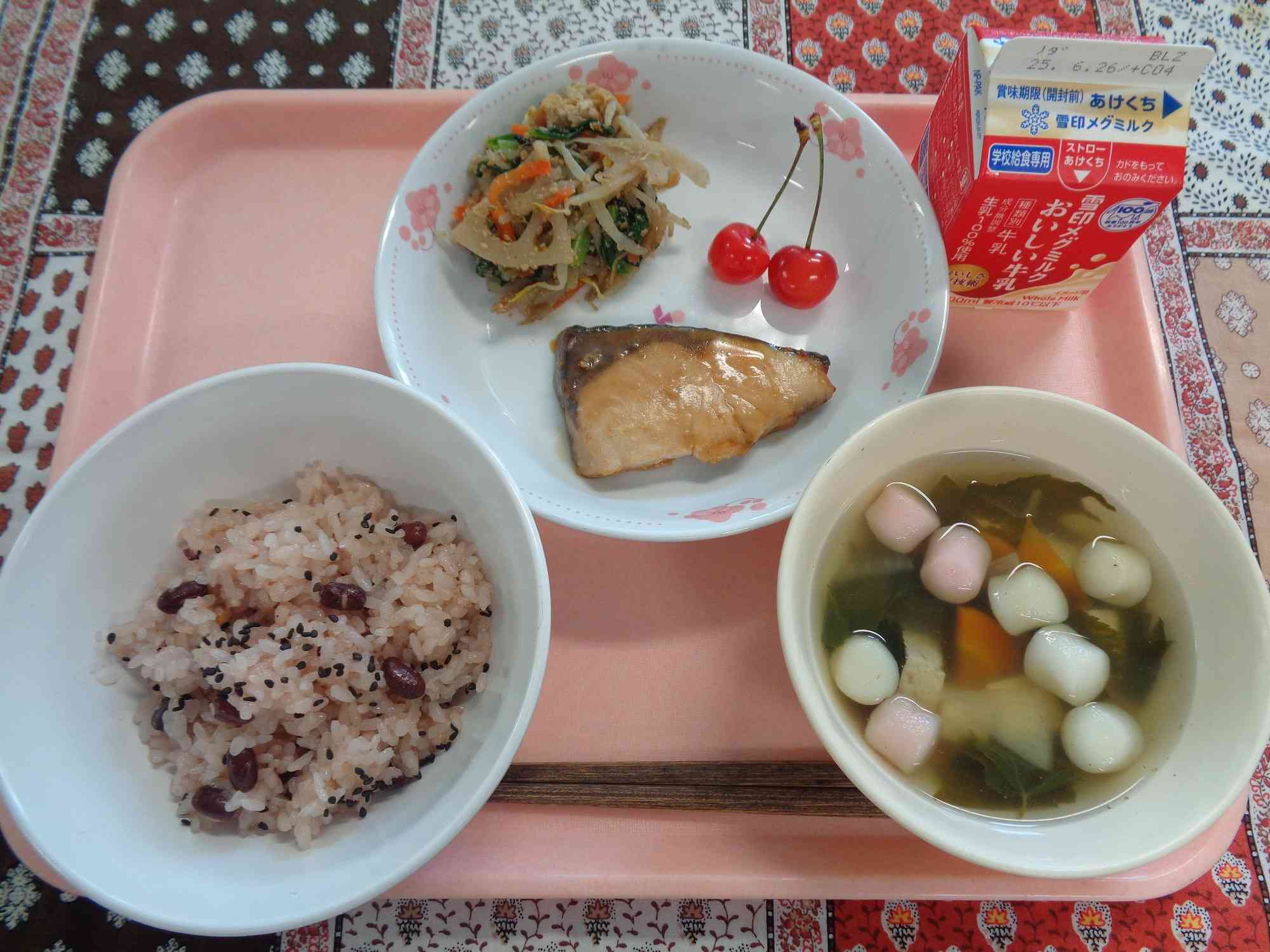 6月19日の給食 ○おせきはん ○ぎゅうにゅう ○ぶりのてりやき ○こんさいのごまあえ ○こうはくはんぺんのすましじる ○さくらんぼ 今日の給食は、豊北小の開校18年目をお祝いする給食です。 おせきはんは、ささげという豆の、赤い茹で汁を入れて炊いた、おめでたい赤色のごはんです。 「ぶりのてりやき」は、成長する度に名前が変わる「出世魚」のぶりを、甘辛く焼きました。「出世」ということから縁起がよく、お祝いの食事によく使われます。 根菜のごま和えは、穴から先を見通せるれんこんや、“地に根をはる”にんじんやごぼうなどの根菜を使いました。 すまし汁には、おめでたい紅白のはんぺんを浮かべました。 たくさんの縁起のよい材料や料理がつまった給食を食べて、みんなで豊北小18歳のお誕生日をお祝いしました!【添付ファイル】