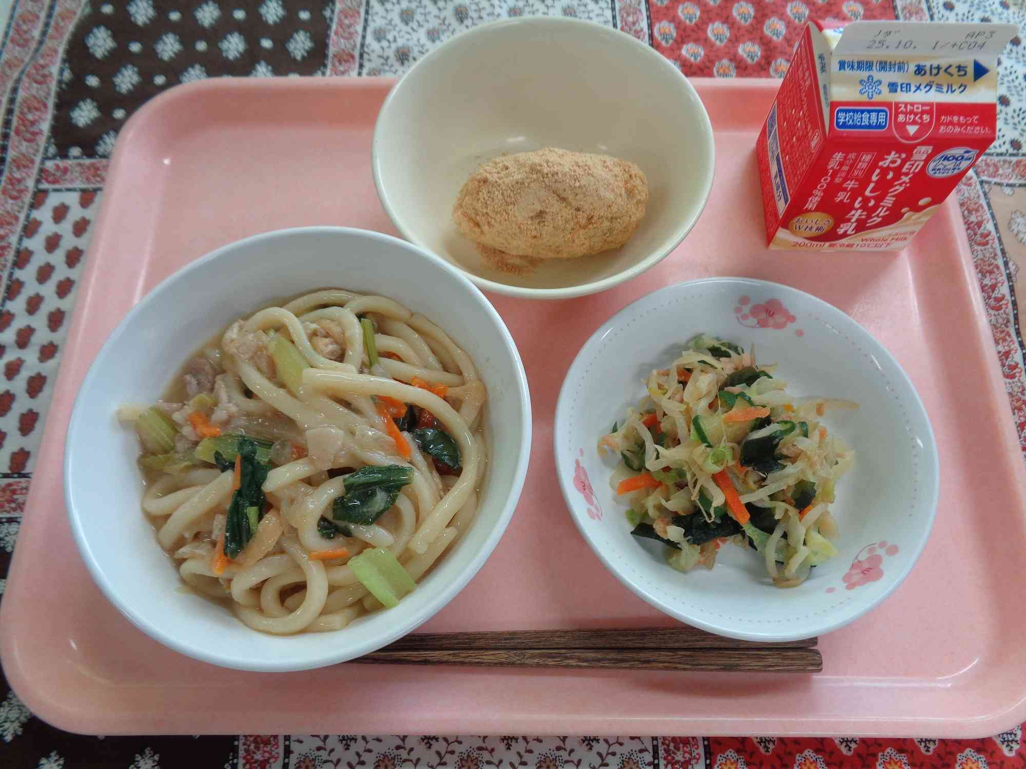 9月19日の給食 ○ごはん ○ぎゅうにゅう ○ホキとじゃがいものチリソース ○もやしのちゅうかあえ ○コーンとたまごのちゅうかスープ 9月22日の給食 ○にくうどん ○ぎゅうにゅう ○ツナとわかめのからしあえ ○きなこおはぎ 秋のお彼岸におはぎを作りました。おはぎの中は、給食室手づくりのあんこ入りです!こどもたちもとってもよく食べてくれていました。