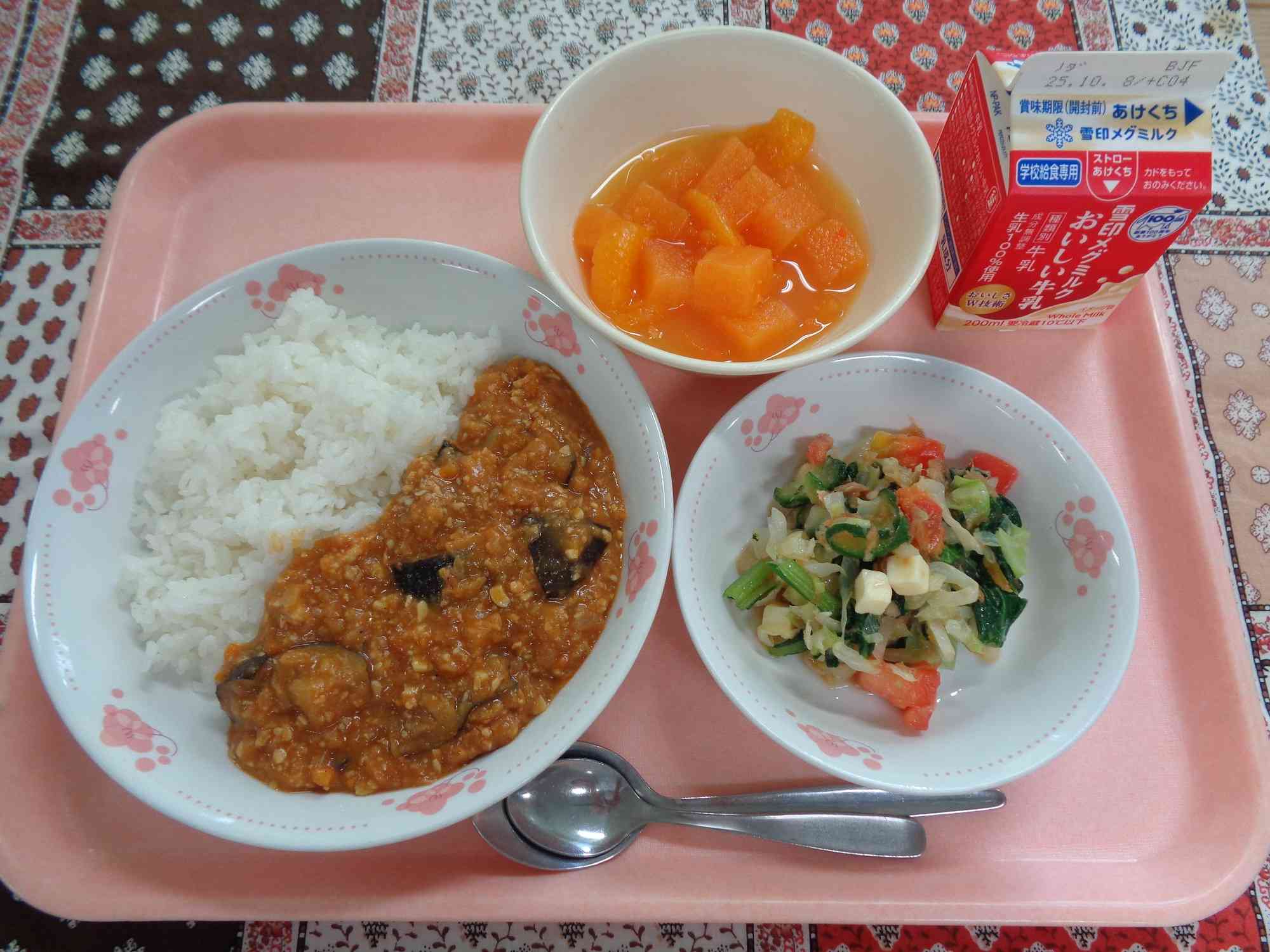 9月26日の給食 ○ごはん ○ぎゅうにゅう ○スンドゥブチゲ ○はるさめサラダ ○なし 9月29日の給食 ○なすいりキーマカレーライス ○ぎゅうにゅう ○こまツナチーズサラダ ○オレンジかんてんポンチ 今日の給食の「なす入りキーマカレーライス」は、油をまぶしてオーブンで焼いた「なす」が主役のキーマカレーを、ごはんの上にたっぷりかけていただきます。 なすはインドが発祥の地とされ、日本でも奈良時代と古くから栽培されている野菜の1つです。全国で色や形もさまざまな種類が栽培されています。 なすは英語で「エッグプラント」といい、日本語で「たまごの植物」という意味です。実はアメリカでは「なす」というと、白くてたまご型の「白なす」のことをいうそうです。そのため、アメリカでなすが実っている様子は、まさにたまごがぶらさがっているようなのだとか。そんななすの実る様子から「エッグプラント」という名前がついたそうです。 特に夏においしくなり、旬をむかえる野菜で、これからの季節の「秋なす」も、「秋茄子は嫁に食わすな」ということわざがあるように、実がギュッとつまっていて、おいしさもより濃厚になります。 そんななすは、みなさんのからだの調子をととのえてくれる「緑色」の食品で、水分が豊富で、体を冷やしてくれる効果があるので、夏の暑い時や体のほてりがある時にぴったりの野菜です。まだ日中は暑さが残っているので、なすを食べて元気にすごしましょう! なす入りキーマカレーはこどもたちに大人気で、全校的な残菜は何と2%でした!【添付ファイル】