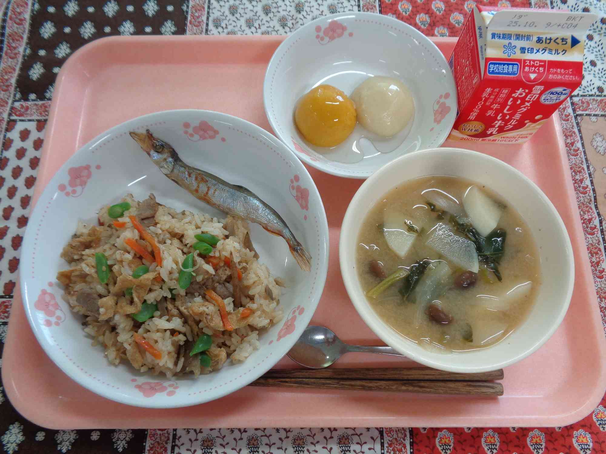 10月6日の給食 ○きんぴらごはん ○ぎゅうにゅう ○やきししゃも ○さといもとあおなのみそしる ○おつきみだんご しろみつがけ 今日10月6日は「十五夜」です。十五夜とは、もともと満月のことをいいます。なので、年に12〜13回めぐってきます。 その満月のなかでも、旧暦の8月の満月は、1年の中で一番空が澄み渡り、月が明るくて美しいとされていました。 そのため、平安時代から月を見て、愛でる会が催され、江戸時代からは、収穫祭として広く親しまれるようになり、十五夜といえば、旧暦の8月15日をさすようになりました。 この旧暦の8月15日は、現在の暦でいうと、毎年9月中旬から10月の初旬にあたり、今年はそれが今日、10月6日にあたります。 また、十五夜は別名「芋名月(いもめいげつ)」といいます。これは、江戸時代から、十五夜に、秋の収穫を感謝する収穫祭が行われていて、お月さまに、この時期にちょうど収穫される、里芋などをお供えしたため、「芋名月」とよばれるようになったそうです。今日はこれにちなんで、里芋を味噌汁の具として使いました。 そして、十五夜というと「お月見だんご」がよく食べられますが、これは、米などの穀類の収穫に感謝し、米を粉にして丸めて作ったのがはじまりといわれています。今日は給食でも、白い白玉だんごと、お月さまをイメージした黄色い白玉だんごに、白みつをからめたデザートにしました。黄色は、茹でてペースト状にしたかぼちゃを練りこんで出しています。どちらのおだんごも、調理員さんが1個1個ていねいに丸めてくれたものです。 今夜の空模様はあいにくの様子ですが、給食で十五夜気分を味わってもらえていたら嬉しいです!【添付ファイル】