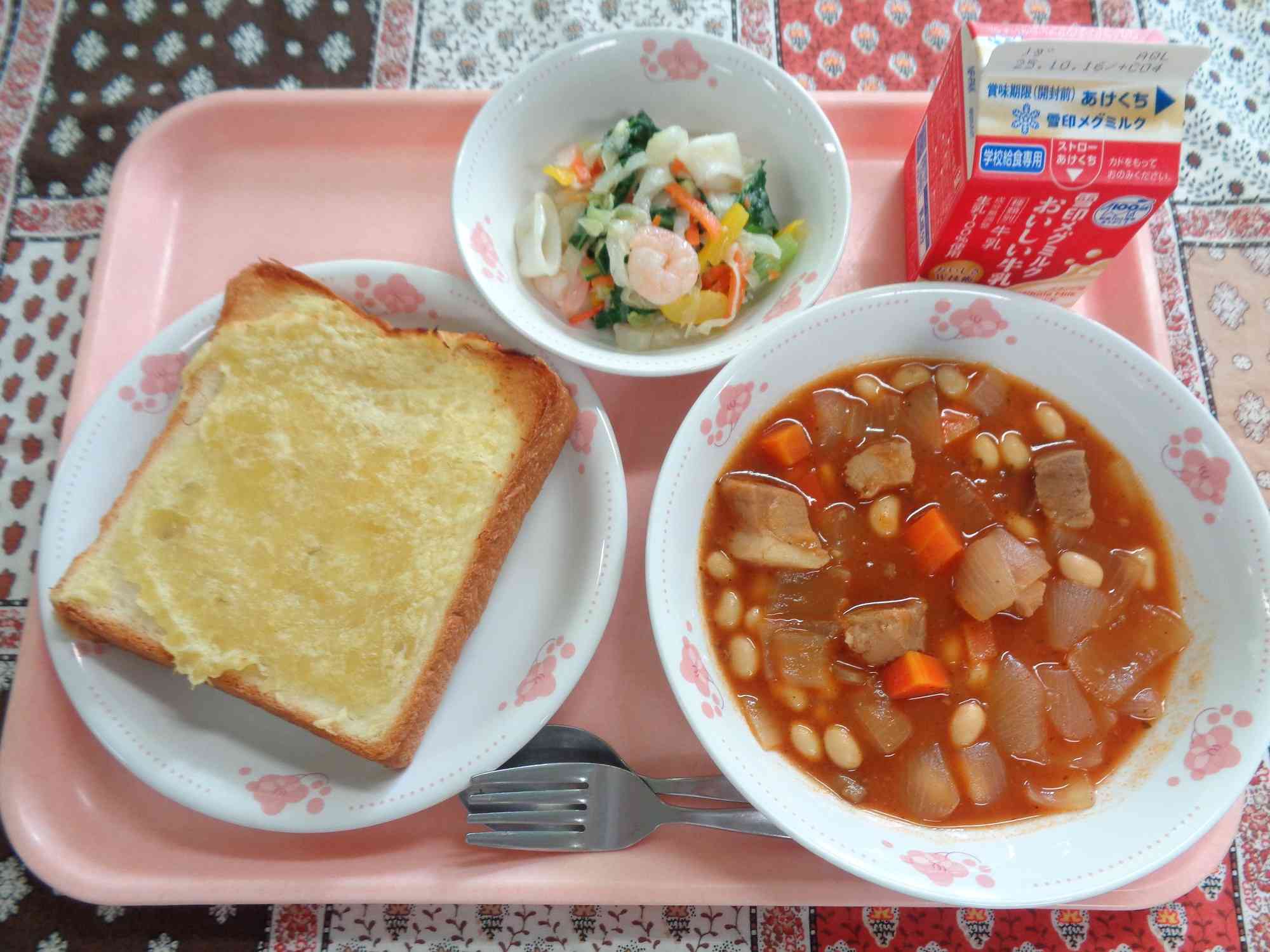10月7日の給食 ○スイートポテトースト ○ぎゅうにゅう ○だいずのようふうにこみ ○シーフードサラダ 今日の給食の「スイートポテトースト」は、名前のとおり、スイートポテトの生地を、食パンに塗ってトーストした料理です。 さつまいもはメキシコを中心とする熱帯アメリカで生まれ、世界的には、紀元前の時代から栽培されていて、とても古くから親しまれてきました。芋掘りを体験したことがあれば分かると思いますが、さつまいもは根っこが太くなったものです。 日本には、1600年頃に中国から琉球(現在の沖縄県)へ、琉球から薩摩藩(現在の鹿児島県)に伝わったため、「さつまいも」と呼ばれるようになったそうです。 1年中出回っていますが、特に9月〜11月にかけてのものは甘みが強くなって、よりおいしくなっています。 さつまいもは、おもにエネルギーのもとになる、黄色の食材で、ごはんやパン、めんの代わりにもなるほど、活動のためのエネルギーをたくさん作り出します。またおなかの調子を整える、食物繊維も多く含んでいます。 今日のトーストは、さつまいもを茹でてつぶし、バター、牛乳、生クリーム、砂糖を加えてなめらかに練ったものを、食パンに塗りました。さつまいものやさしい甘みとバターや生クリームのコクがおいしいトーストに仕上がりました。 こどもたちも「今日のパン、すごくおいしかった!」と話してくれる子が多く、調理員さんが一生懸命作ってくれたスイートポテトーストは、大成功だったようです。 今の季節においしいさつまいも、おうちのごはんにもぜひ活用してみてください!【添付ファイル】