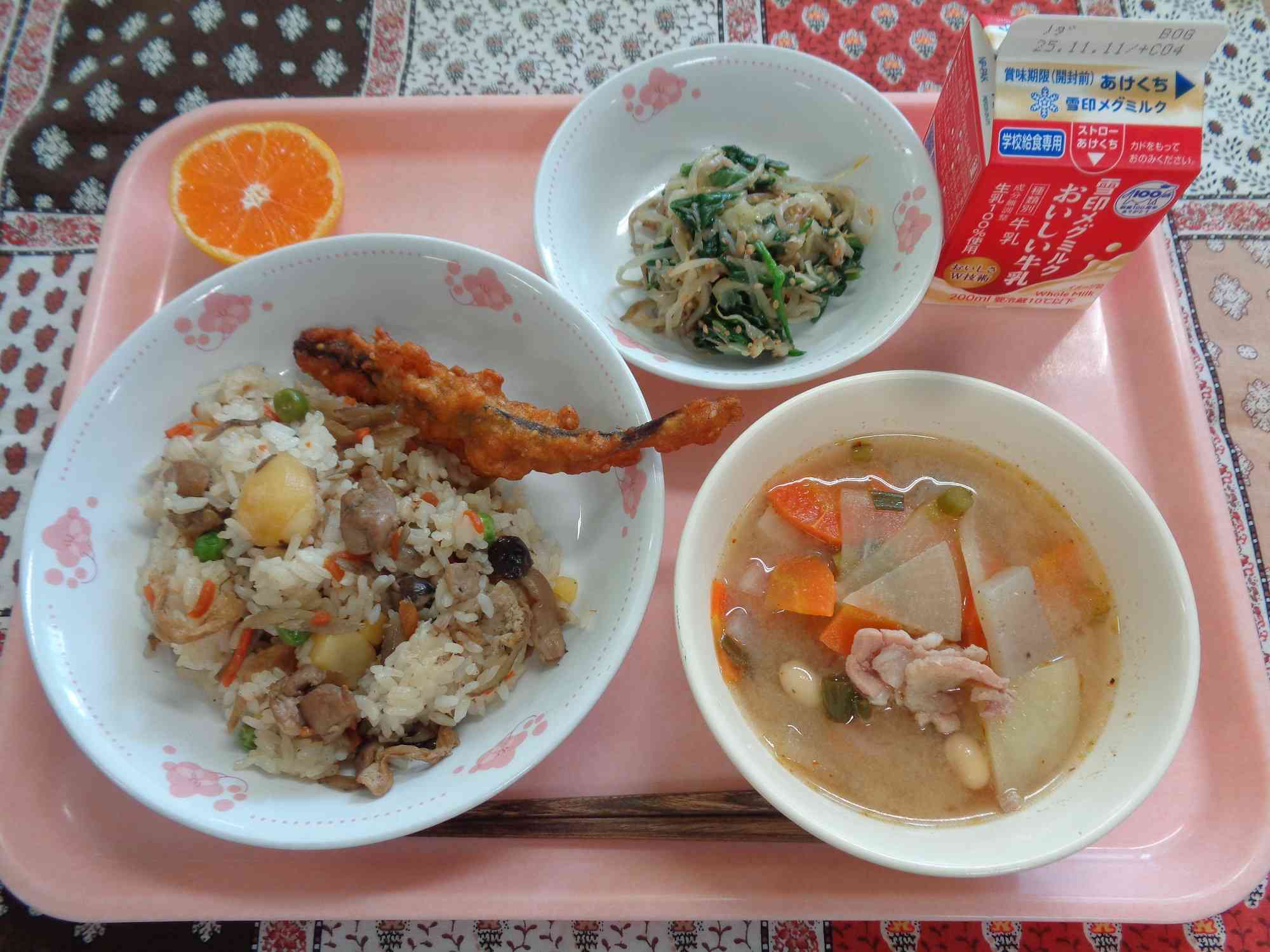 11月4日の給食 ○くりいりごもくごはん ○ぎゅうにゅう ○ししゃものもみじあげ ○ほうれんそうのごまじょうゆあえ ○だいずいりとんじる ○きっかみかん 一昨日11月2日は「十三夜」でした。十三夜とは、「十五夜」の次に美しい月が見られるといわれている日です。十五夜は、旧暦で8月15日にあたる日のことですが、十三夜はこの十五夜の日からおよそ1ヶ月後にやってくる、旧暦で9月13日にあたる日のことです。新暦に直すと、その年によって日付が変化し、今年はこれが11月2日にあたります。 十五夜と同じように、空が澄みわたり、明るくて美しい満月が見られる日いうことで、十五夜と合わせて十三夜のお月見も大切にされてきました。そのため、十五夜と十三夜、どちらかの片方の月しか見ないことを「片見月(かたみつき)」といって、縁起の悪いこととされていたそうです。 そして、十五夜が別名「芋名月」とよばれるのに対し、十三夜は別名「栗名月」「豆名月」といいます。これは、この時期にちょうど収穫される、栗や豆(枝豆、大豆)をお月さまにお供えしたためです。 また、十五夜は古代中国から伝わった行事であるのに対し、十三夜は日本ならではの風習だといわれています。実際、鎌倉時代に記されたかの有名な「徒然草」にも、十五夜と十三夜は月を眺めるのに良い夜…と述べられているそうで、かなり古くからの風習であるようです。 今日は栗と豆を使った、十三夜給食にしました。 栗はごはんに、豆(大豆)は豚汁に使用しましたが、どちらもよく食べてくれていました。 日本人として和食の良さを理解し、未来の子供たちに伝えていってもらえたら…と願っています。また、給食で「十三夜」という行事のことを少しでも理解してもらえたらうれしいです。【添付ファイル】