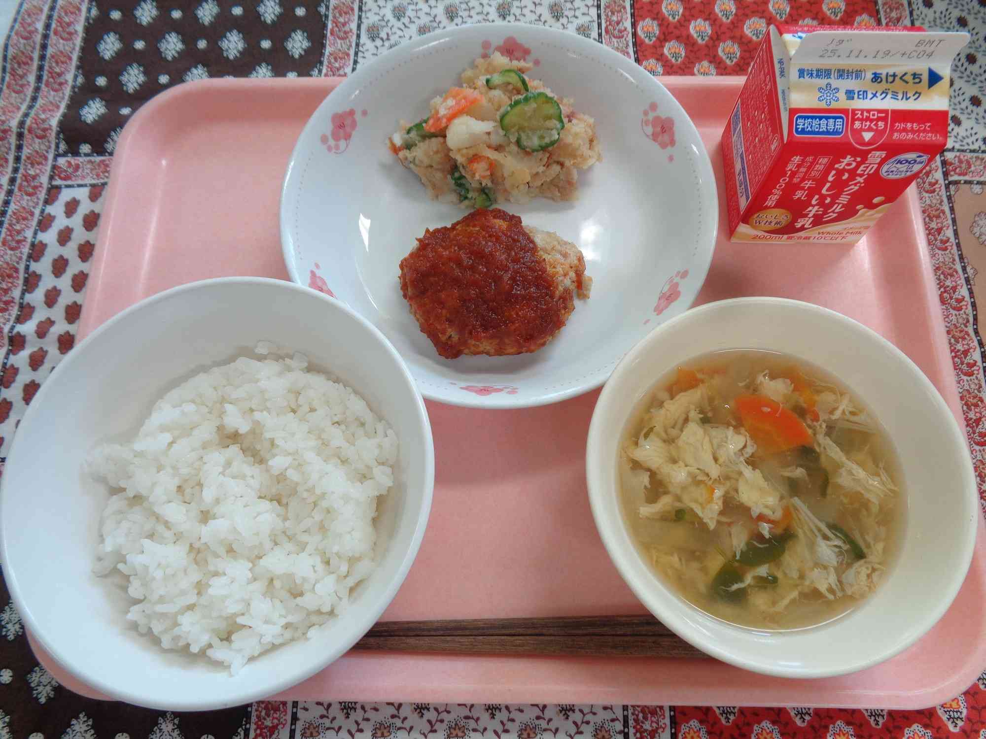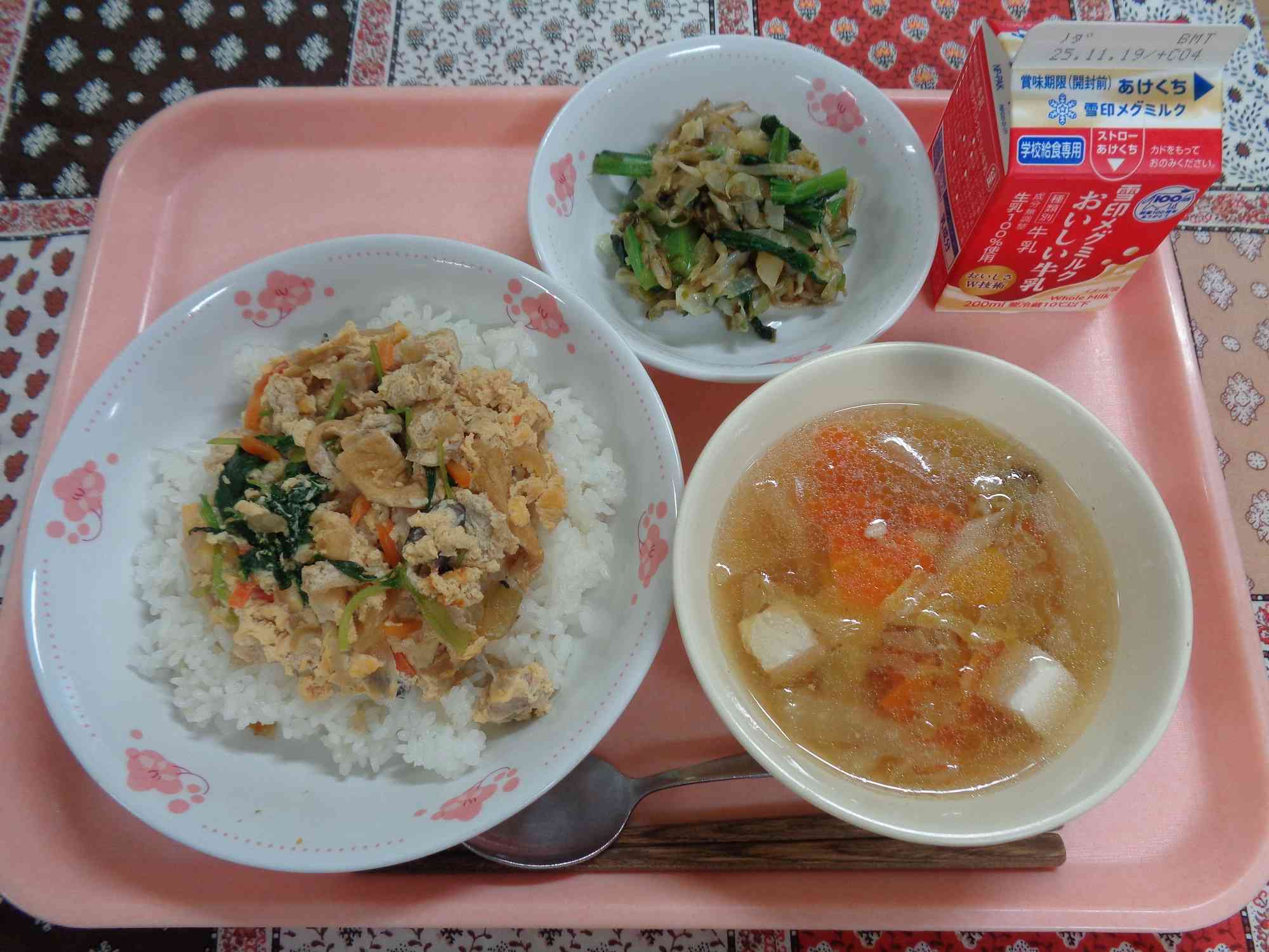 11月7日の給食 ○ごはん(あきだわら) ○ぎゅうにゅう ○ふわふわとうふハンバーグ ○かわりポテトサラダ ○とうみょうのかきたまじる 今月はお米がおいしい今の季節に合わせて、「お米食べ比べ」として4種類のお米を給食で出していきます。初日のこの日は、あきだわらというお米でした。 あっさりとした食感で、味もさっぱりとしているのが特徴のお米です。この日のハンバーグのような、味のしっかりとしたおかずとよく合います。 この日は給食時間に教室を回っていると、「ごはんがおいしかった!」「あきだわら、おいしいです!」と声をかけてくれるこどもが多く、お米に注目してごはんを食べている様子が見られました。 ぜひ「お米食べ比べ」の4日間は、何かと一緒に…だけではなく、ごはんそのものでも味わってみてもらいたいと思います! 11月10日の給食 ○おあげのたまごとじどん ○ぎゅうにゅう ○いそかあえ ○くずきりじる【添付ファイル】