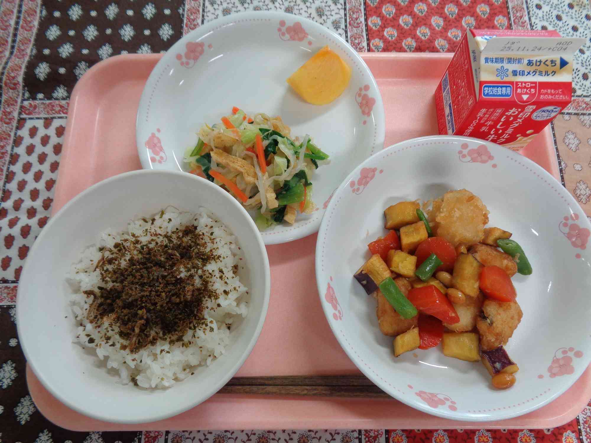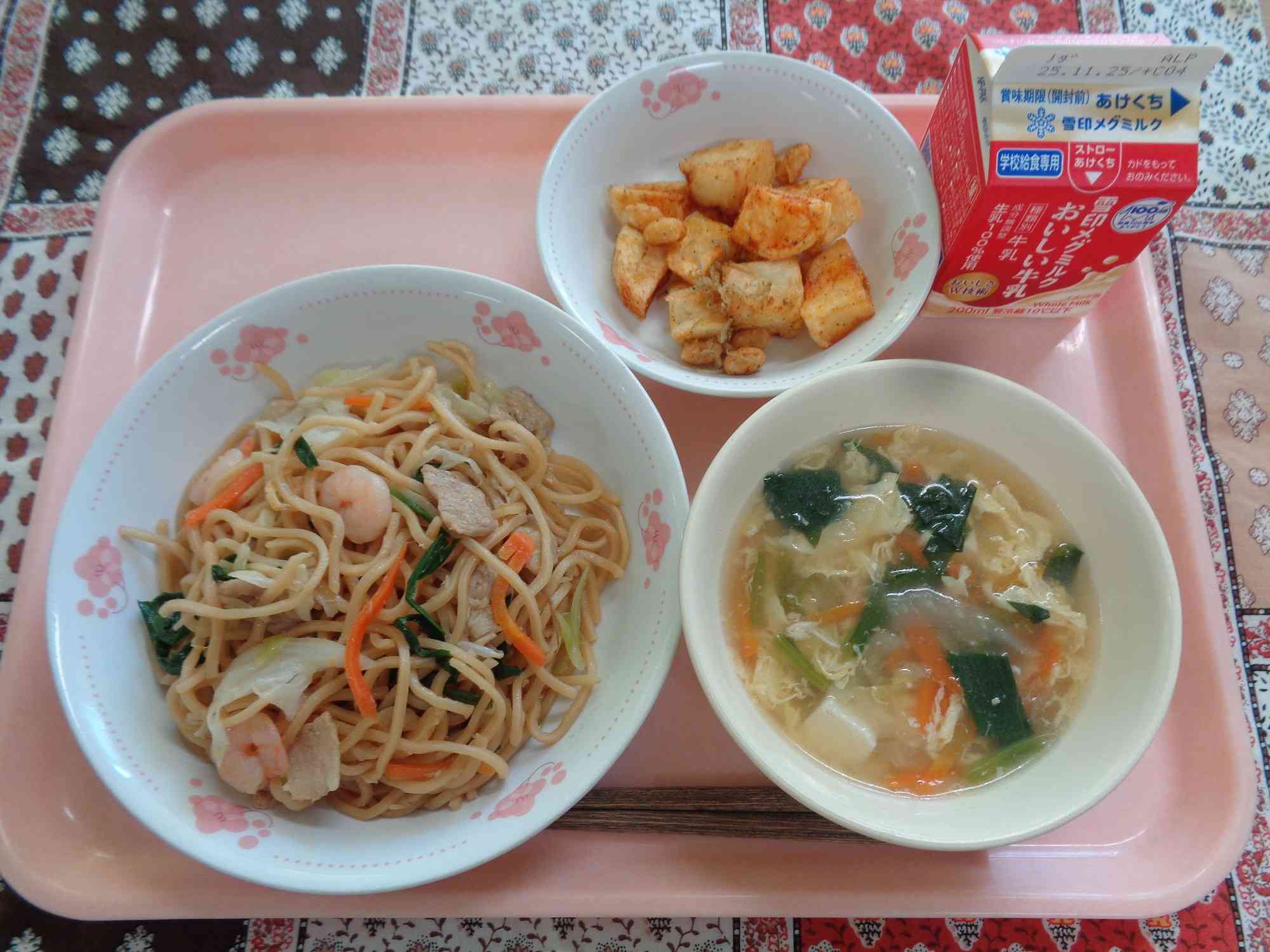 11月13日の給食 ○ごはん(ひとめぼれ) おかかふりかけ ○ぎゅうにゅう ○さかなとやさいのごしきあえ ○カリカリあぶらあげいりゆでやさい ○かき 11月14日の給食 ○シャンハイやきそば ○ぎゅうにゅう ○じゃがいもといりこのスパイシーあげ ○とうふのちゅうかふうたまごスープ シャンハイやきそばは、中国の上海地方で食べることができる麺料理「上海炒麺(シャンハイチャオメン)」を給食向けにアレンジしたものです。中国の上海では、うどんより細く、そばより太いモチモチした麺を炒め、濃い色で、砂糖が入っている「老油(ラオユ)」という、とろみのある甘口のしょうゆで味付けします。給食では、手に入りやすいオイスターソースという中国の調味料と、日本のしょうゆでその味に近付けました。 こどもたちも「おいしい!」とよく食べてくれていました。【添付ファイル】