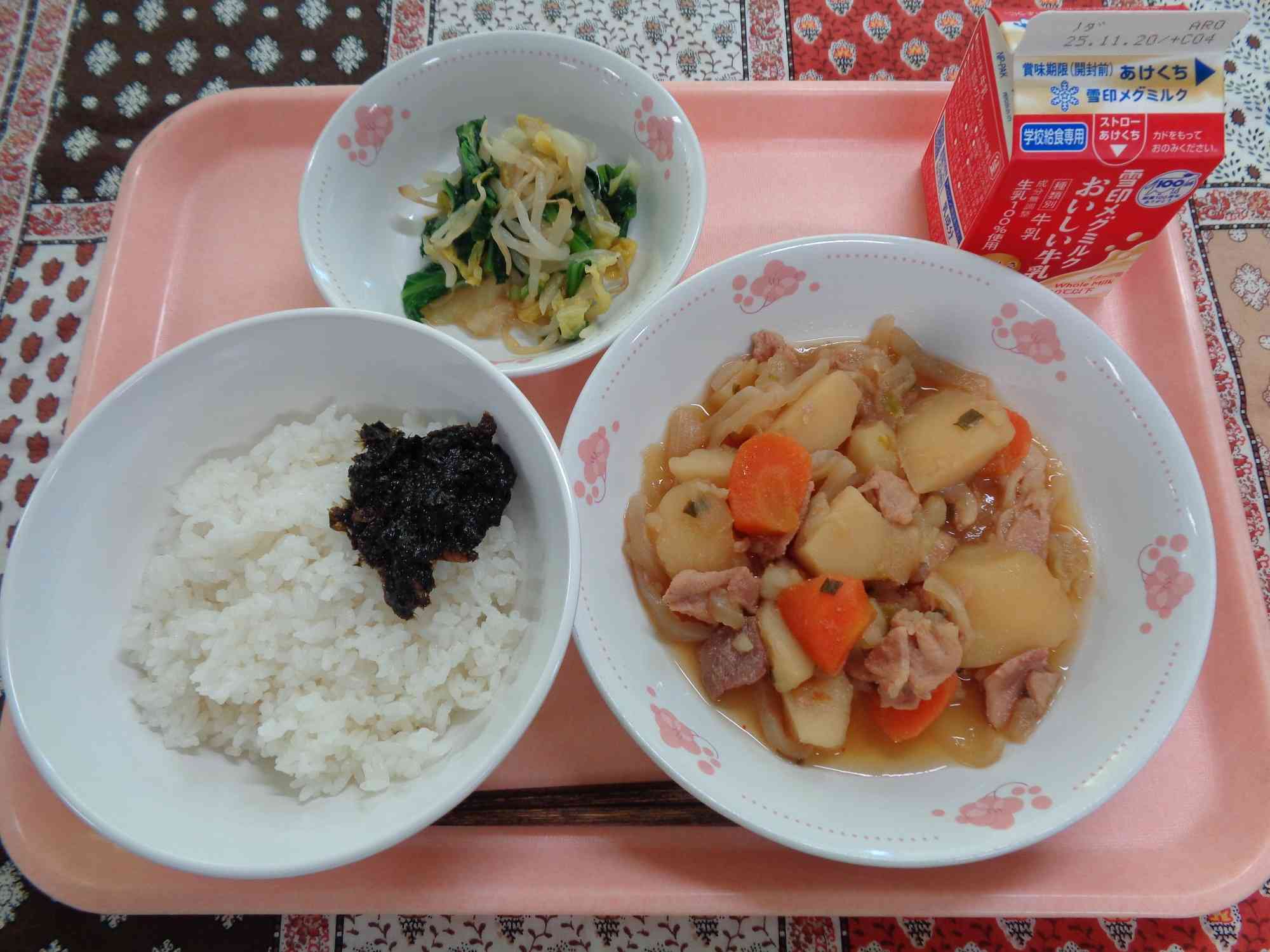 11月17日の給食 ○ごはん あさりとのりのつくだに ○ぎゅうにゅう ○スタミナにくじゃが ○ゆでやさいからしじょうゆ スタミナ肉じゃがは、給食で数ある肉じゃがレシピの中でも非常に人気のあるメニューです。 「スタミナ」の所以は、体力をつけてくれる生姜とにんにくを使うところと、血行を良くして体の疲れをとってくれる唐辛子を使っているところです。 パンチのきいた味付けで、こどもたちも白いご飯がよく進んだようです!【添付ファイル】