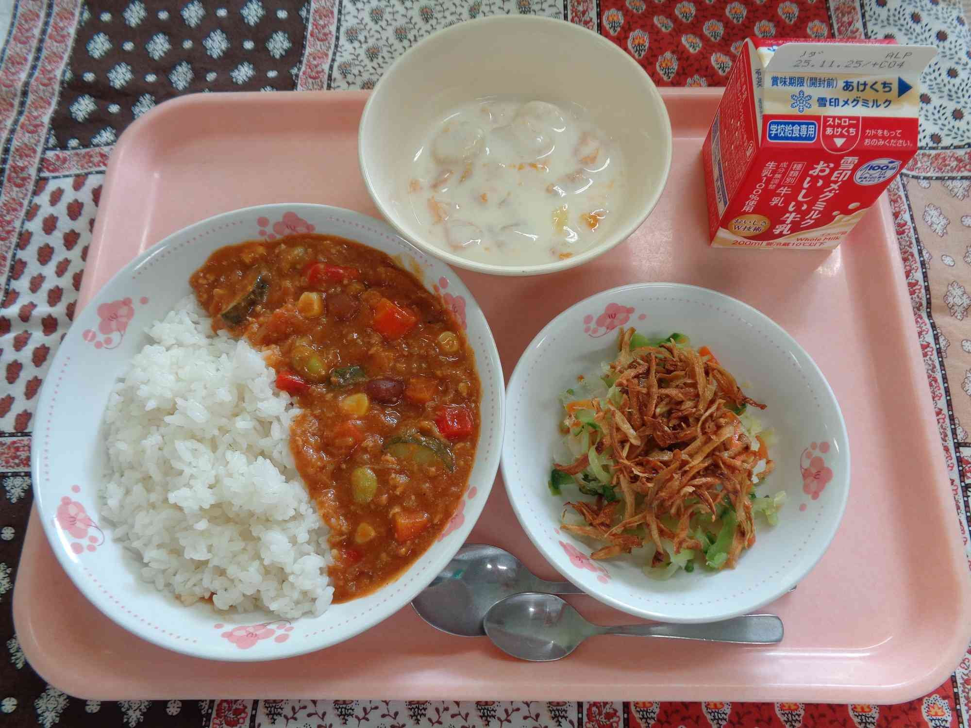 11月18日の給食 ○カラフルにじいろカレーライス ○ぎゅうにゅう ○ポキポキこえだサラダ ○フルーツヨーグルト 今日の給食も、てんらんかいの各学年の作品とコラボレーションをした、「コラボメニュー」第2弾です! 今日は4年生の作品「虹のゲート」から「カラフル虹色カレーライス」、「ある日のツリーハウス」から「ポキポキ小枝サラダ」を作りました。 「虹のゲート」は、豊北小玄関の頭上に、4年生みんなで作った色のカケラをつなげ合わせて、大きな虹を表現します。給食でも、赤はパプリカ、オレンジはにんじん、黄はコーン、黄緑は枝豆、緑はズッキーニ、紫は金時豆…といろんな色の材料を集め、おいしいカレーを作りました。 小枝サラダは、ツリーハウスを作っている枝をイメージして、カリッと揚げたごぼうのチップスをトッピングしたサラダです。 給食時間に教室を回ると、特に作品を制作中の4年生が「今日は4年生のメニューなんだよね!」「どの料理もおいしい~!」とたくさん声をかけてくれました。給食室でもとてもカラフルな虹色のカレーライスに、歓声が上がっていました。 今日のコラボメニューから、こどもたちが展覧会をもっと楽しみにしてくれればいいな…と思います。【添付ファイル】